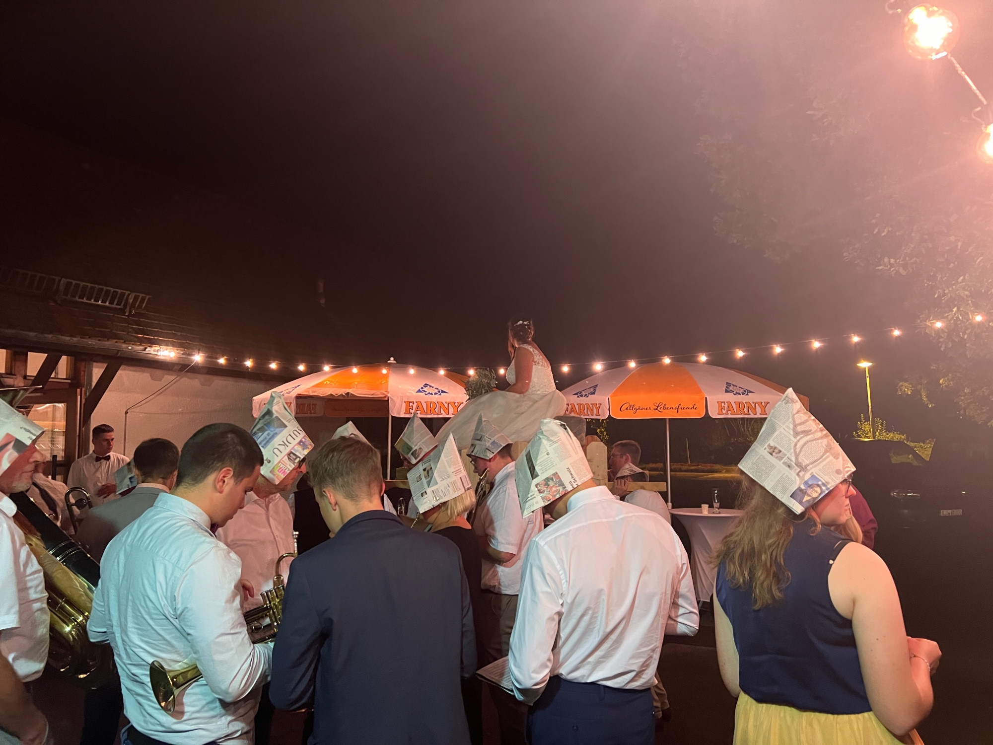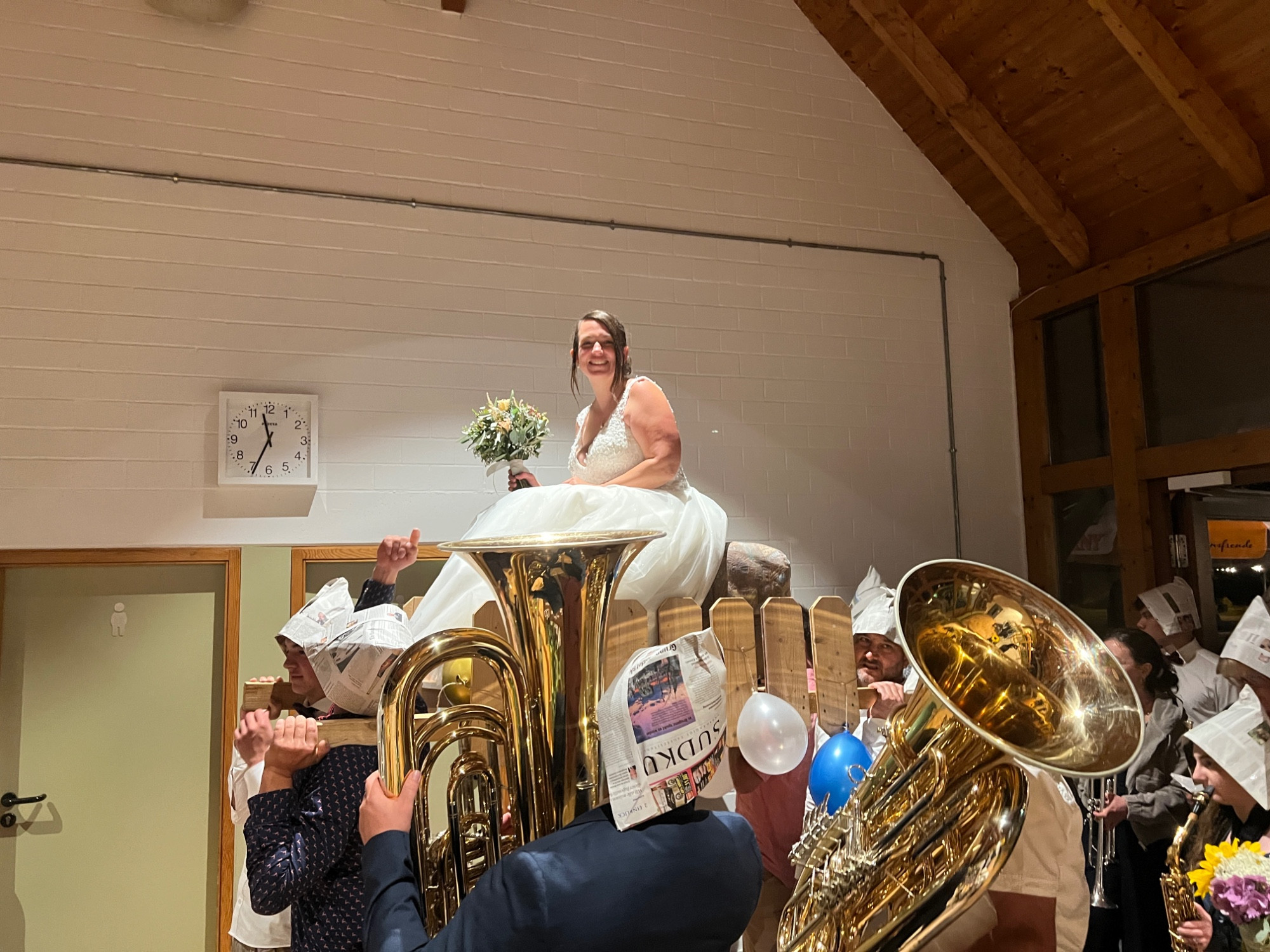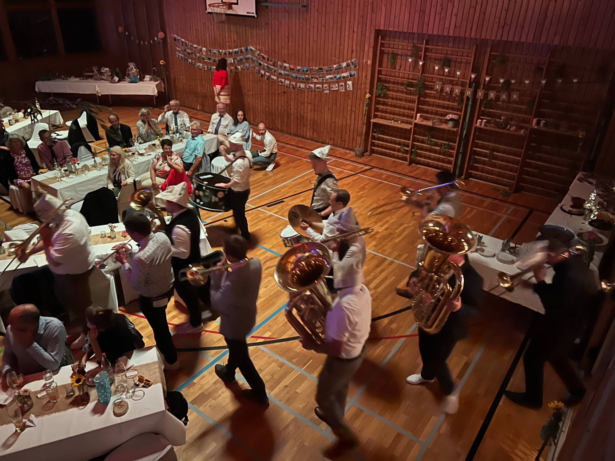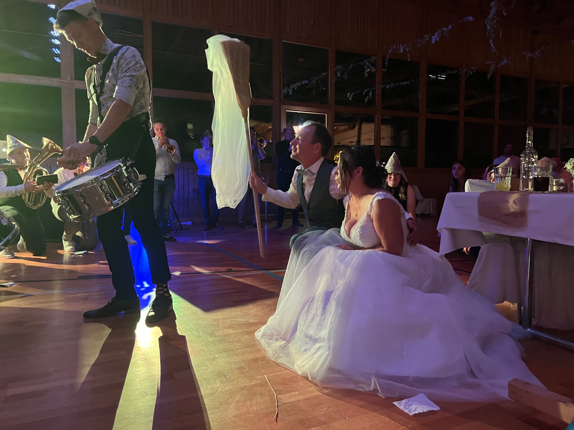 Zu späteren Stunde durfte der Musikverein, nach einem kurzweiligen und witzigen Programmpunkt, die Braut entführen, während Christoph mit einem Besen tanzen musste. Nach ein paar Minuten und ein paar Gläsern Sekt wurde die Braut von den Musikanten wieder zurück in die Halle gebracht, wo die Party bis spät in die Nacht weiterging.