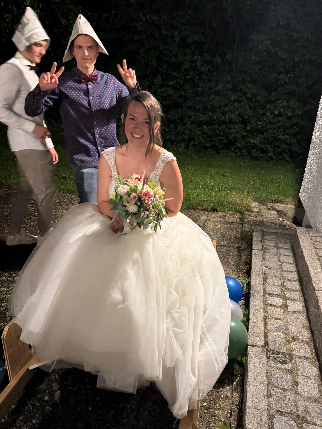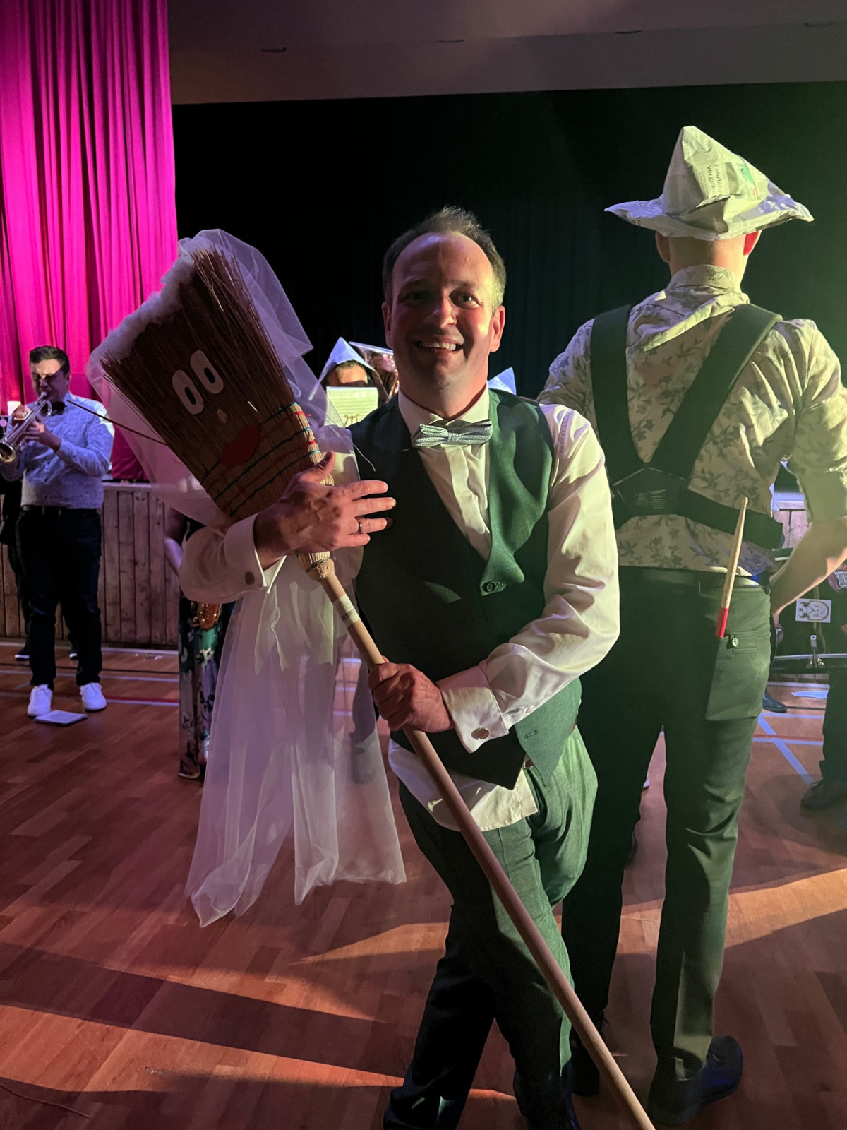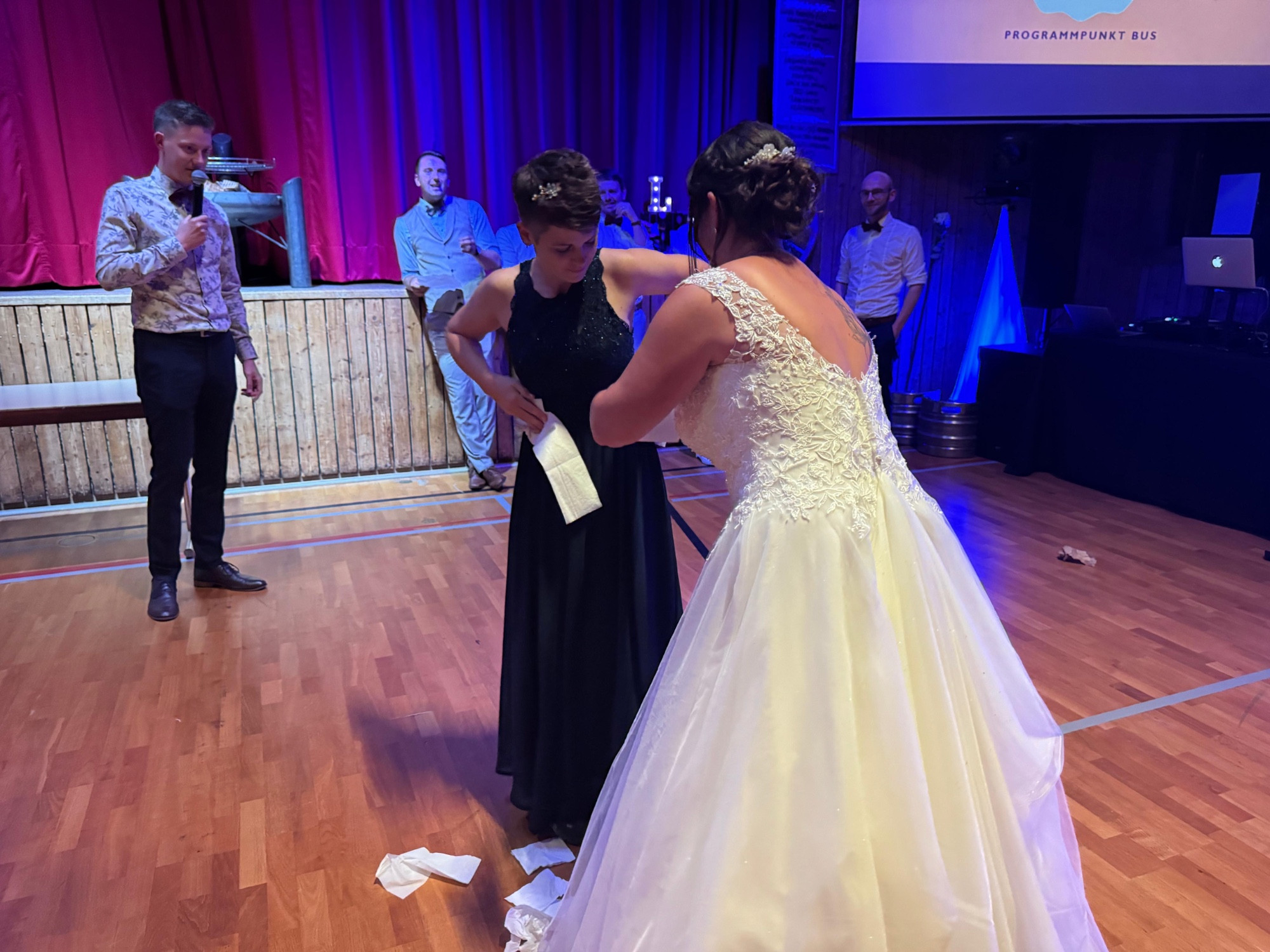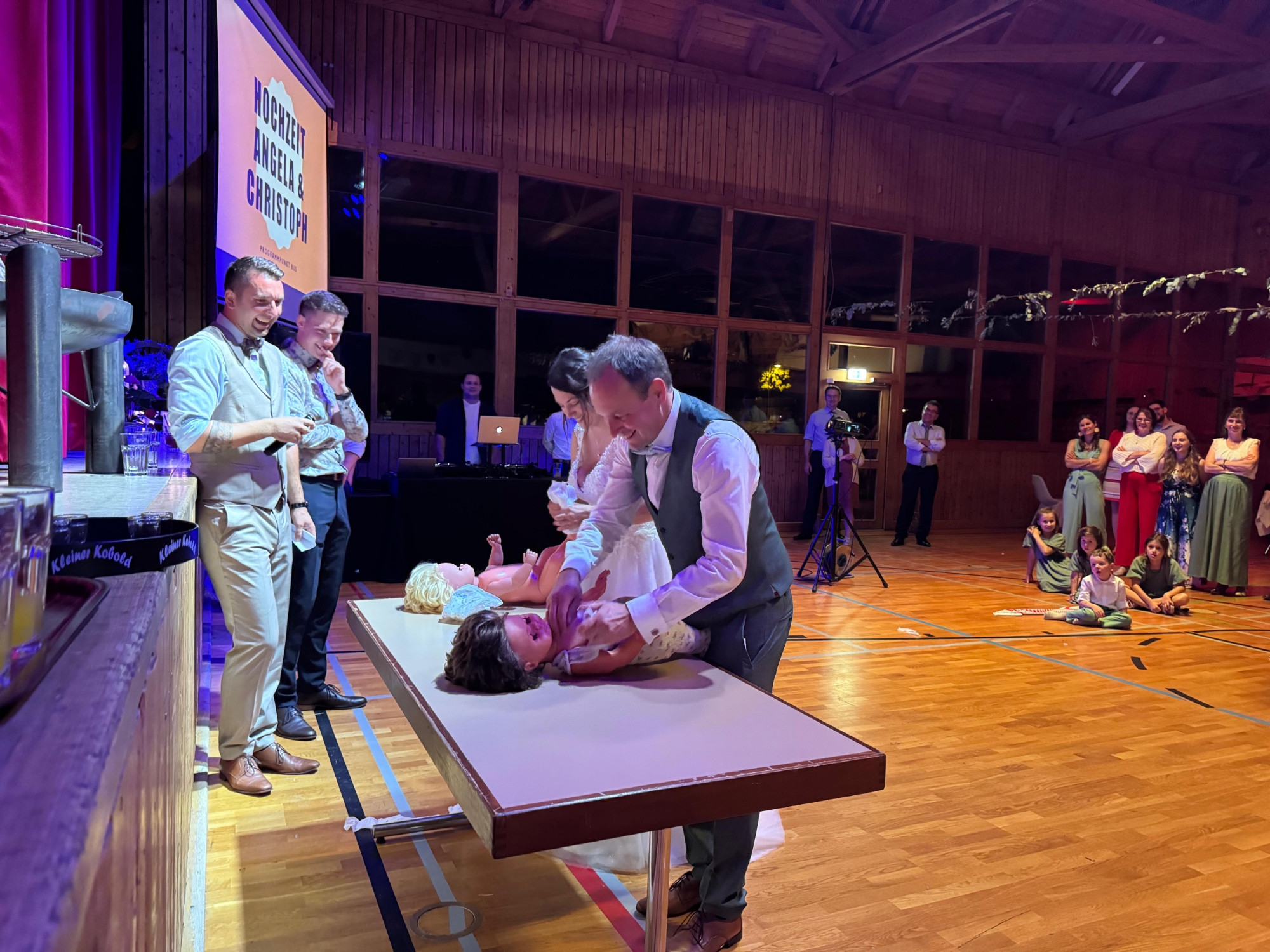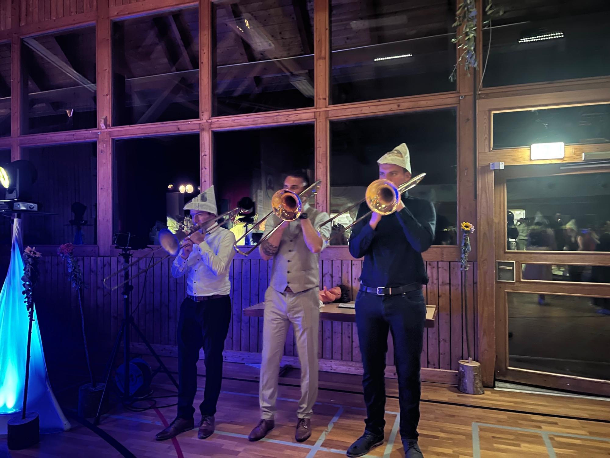 Zu späteren Stunde durfte der Musikverein, nach einem kurzweiligen und witzigen Programmpunkt, die Braut entführen, während Christoph mit einem Besen tanzen musste. Nach ein paar Minuten und ein paar Gläsern Sekt wurde die Braut von den Musikanten wieder zurück in die Halle gebracht, wo die Party bis spät in die Nacht weiterging.