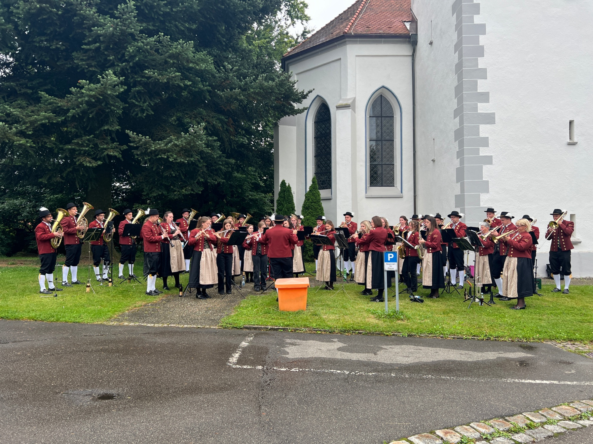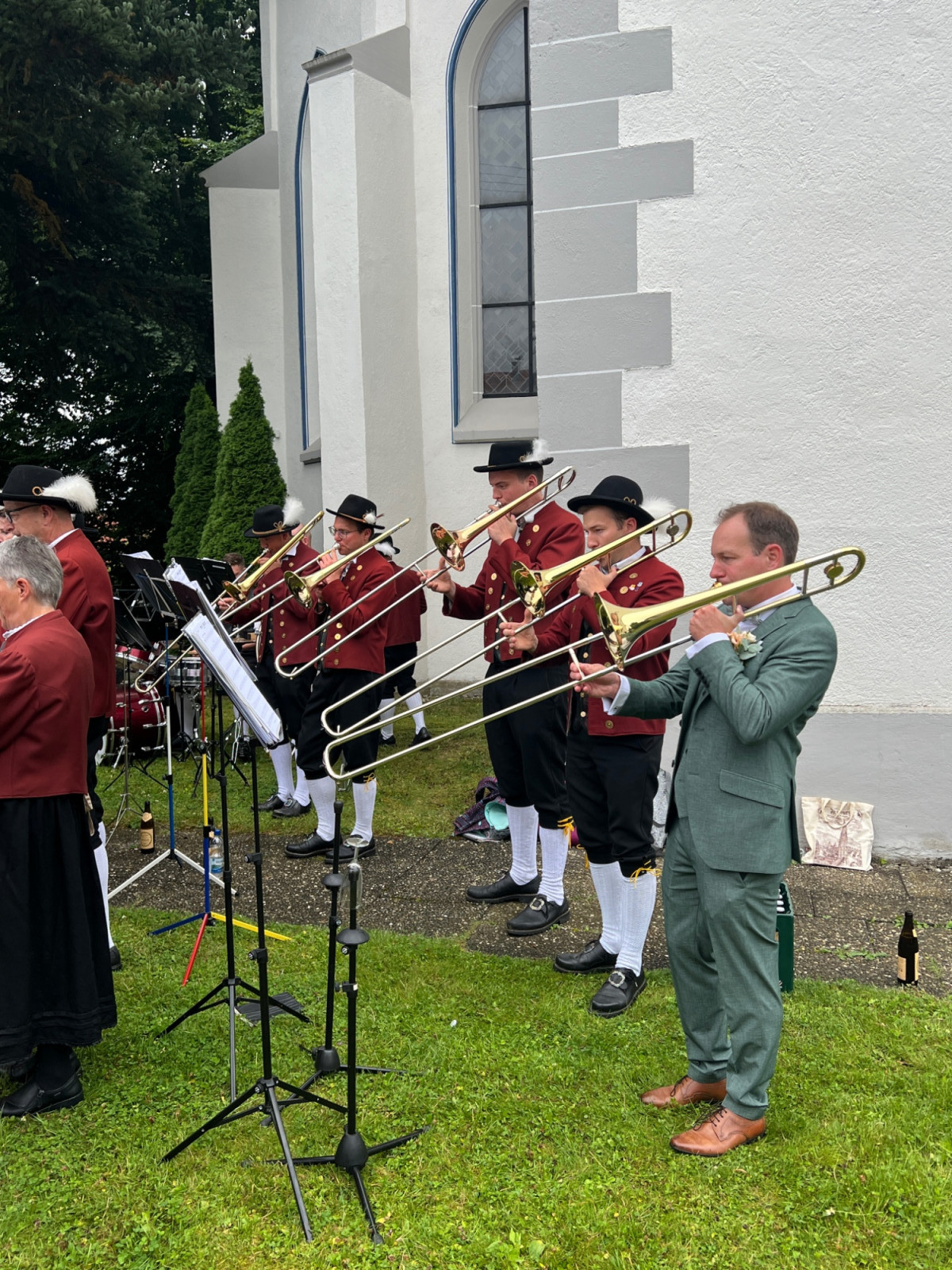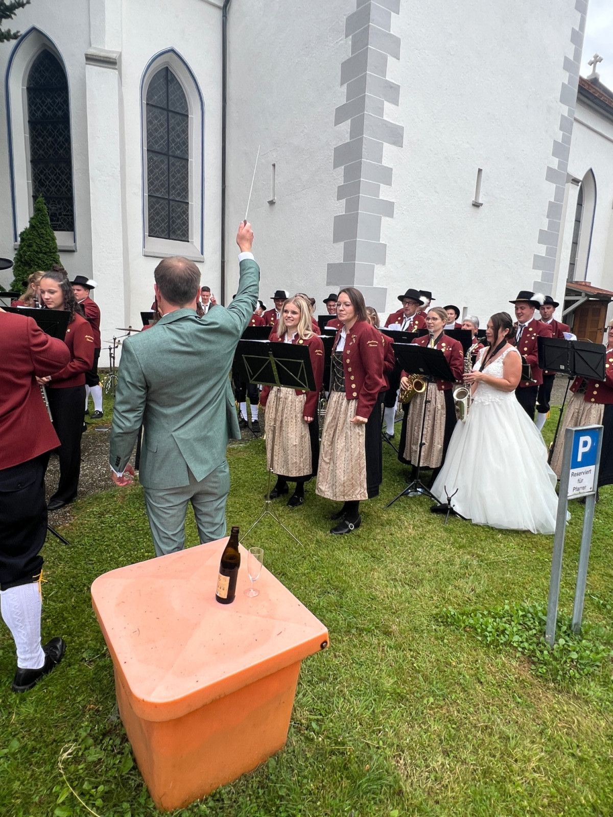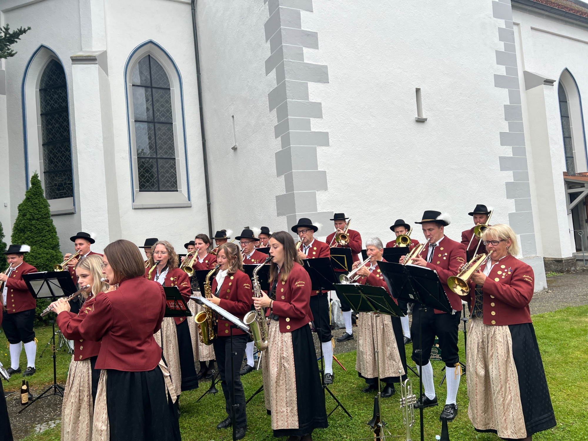 Nach einer produktiven Generalprobe am Freitagabend in der Kirche stand am Samstag dann die kirchliche Trauung an. Zur großen Erleichterung hielt das trockene Wetter an und der Regen hielt sich zurück. Nachdem die aktive Kapelle gemeinsam mit dem Brautpaar zur Kirche marschiert war, fand um 13:30 Uhr die wunderschöne Traufeier statt. Der Musikverein durfte den Gottesdienst gemeinsam mit der Organistin musikalisch begleiten. Das Brautpaar gab sich vor der Familie, Freunden und Vereinskameraden das Ja-Wort.