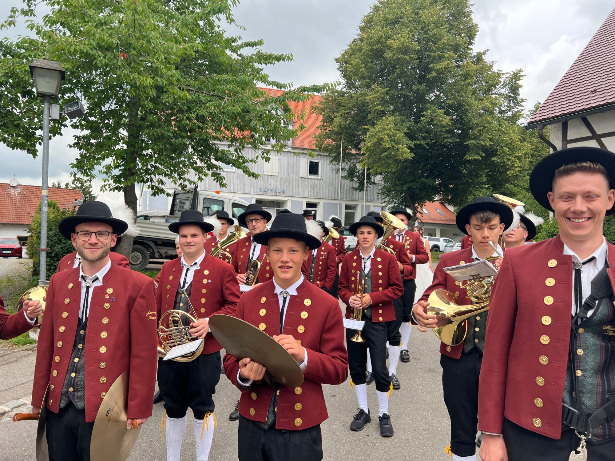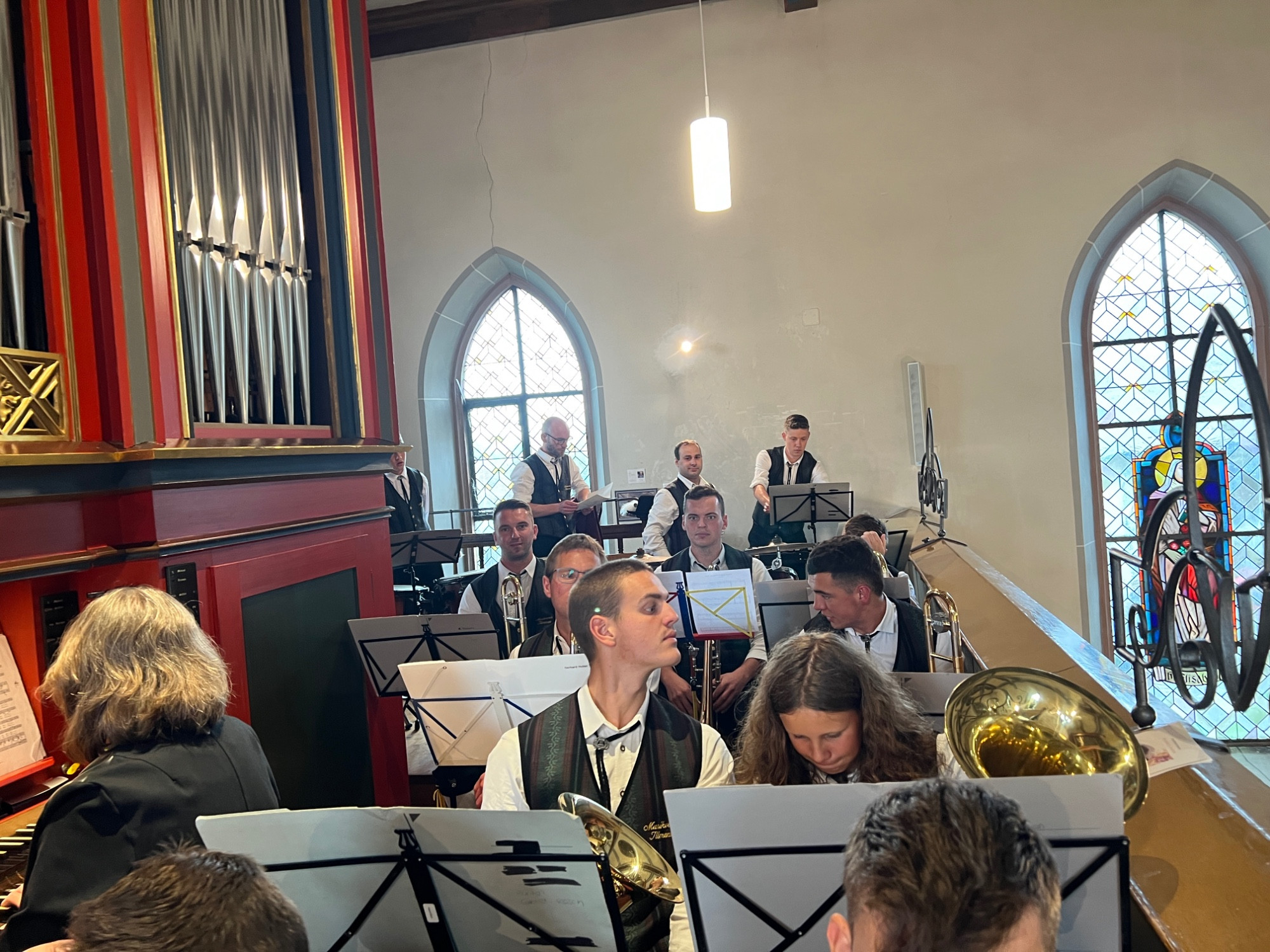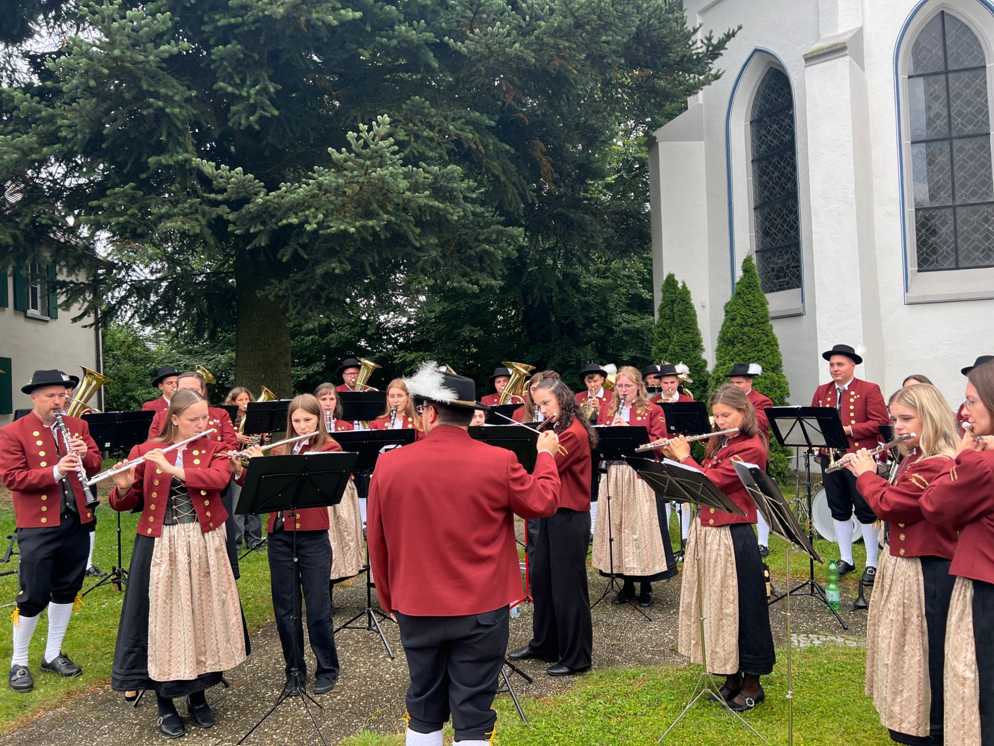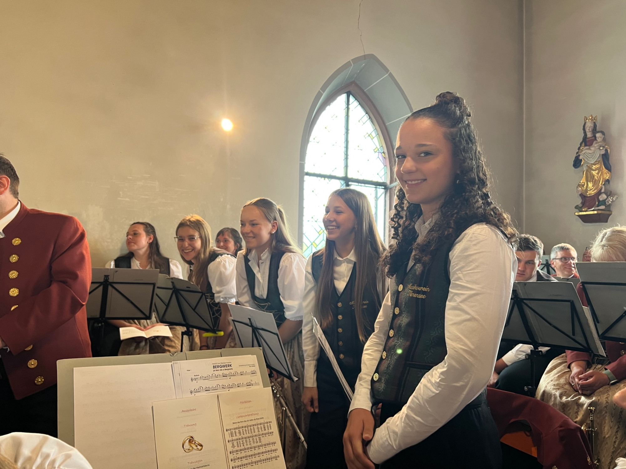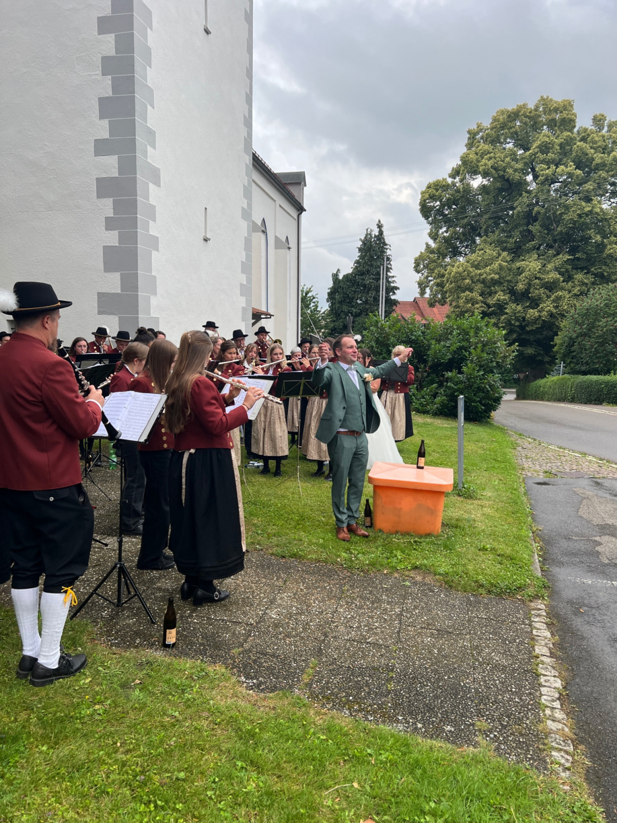 Nach einer produktiven Generalprobe am Freitagabend in der Kirche stand am Samstag dann die kirchliche Trauung an. Zur großen Erleichterung hielt das trockene Wetter an und der Regen hielt sich zurück. Nachdem die aktive Kapelle gemeinsam mit dem Brautpaar zur Kirche marschiert war, fand um 13:30 Uhr die wunderschöne Traufeier statt. Der Musikverein durfte den Gottesdienst gemeinsam mit der Organistin musikalisch begleiten. Das Brautpaar gab sich vor der Familie, Freunden und Vereinskameraden das Ja-Wort.