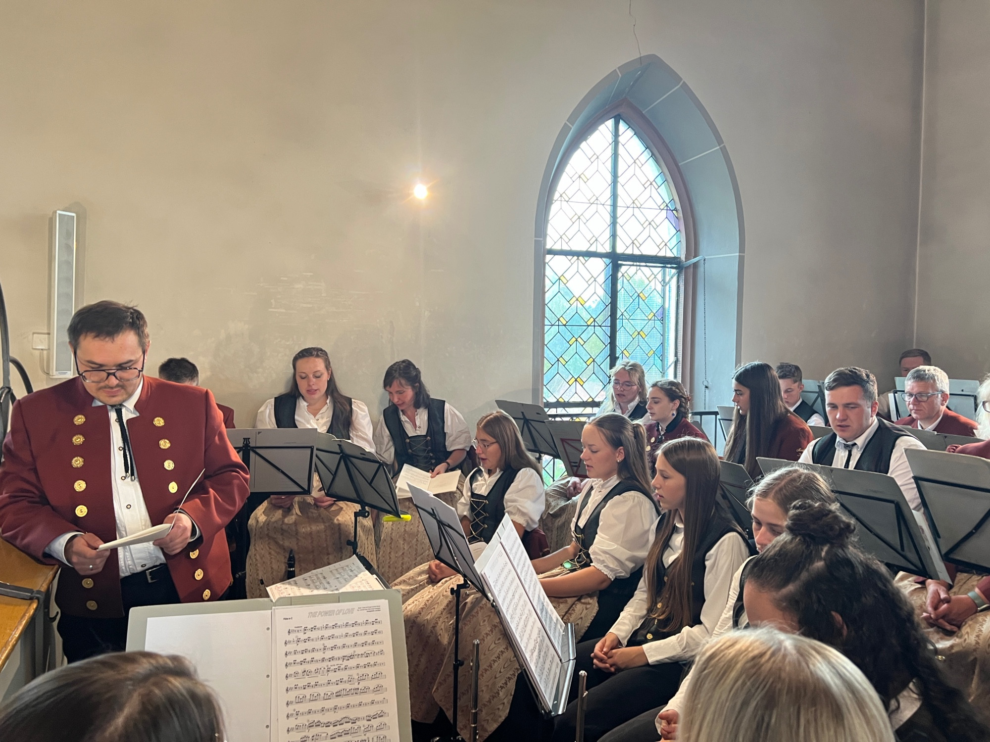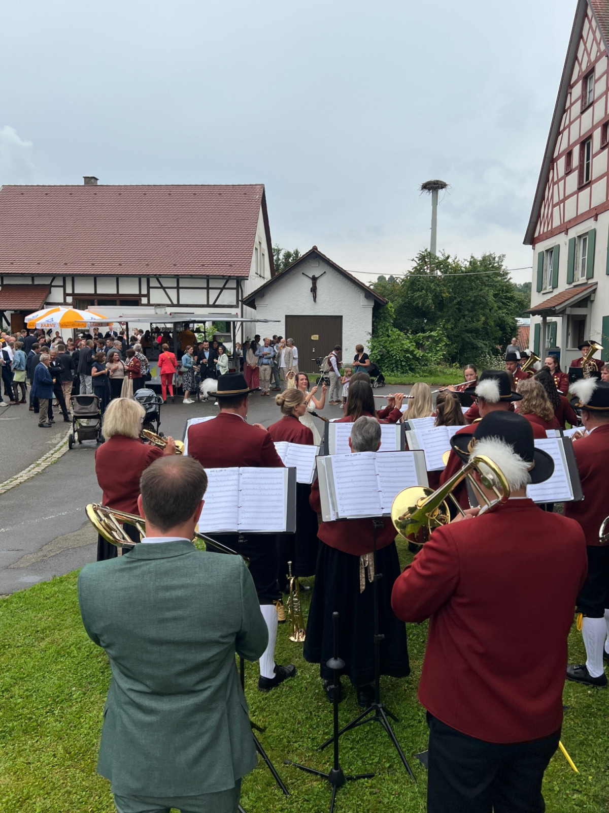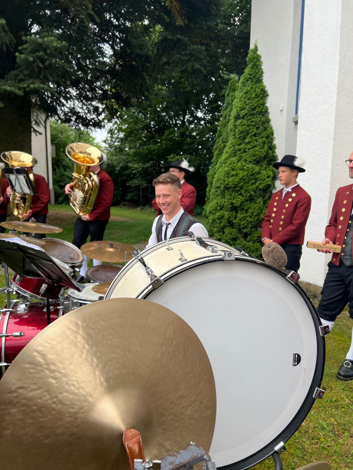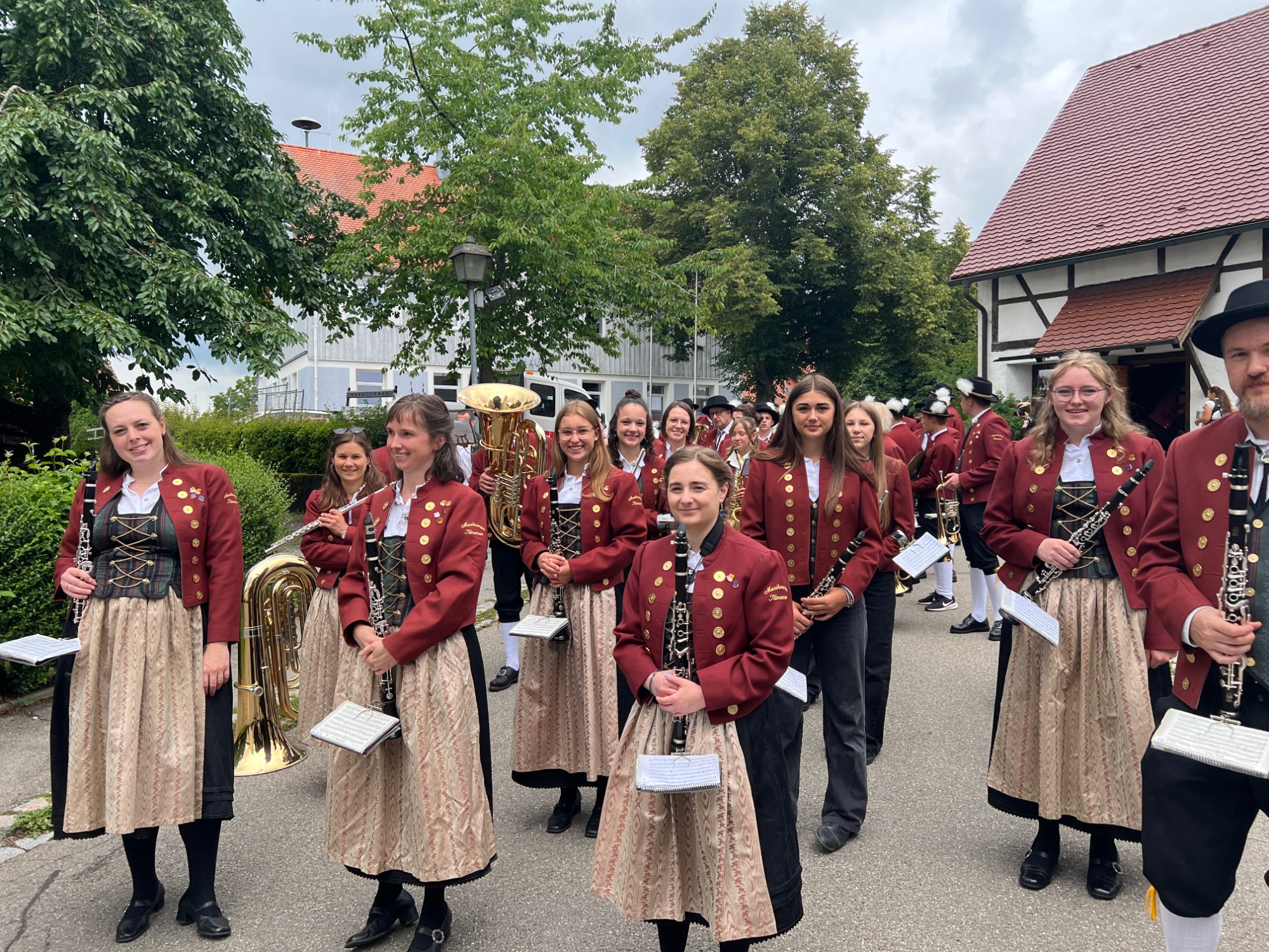 Nach einer produktiven Generalprobe am Freitagabend in der Kirche stand am Samstag dann die kirchliche Trauung an. Zur großen Erleichterung hielt das trockene Wetter an und der Regen hielt sich zurück. Nachdem die aktive Kapelle gemeinsam mit dem Brautpaar zur Kirche marschiert war, fand um 13:30 Uhr die wunderschöne Traufeier statt. Der Musikverein durfte den Gottesdienst gemeinsam mit der Organistin musikalisch begleiten. Das Brautpaar gab sich vor der Familie, Freunden und Vereinskameraden das Ja-Wort.