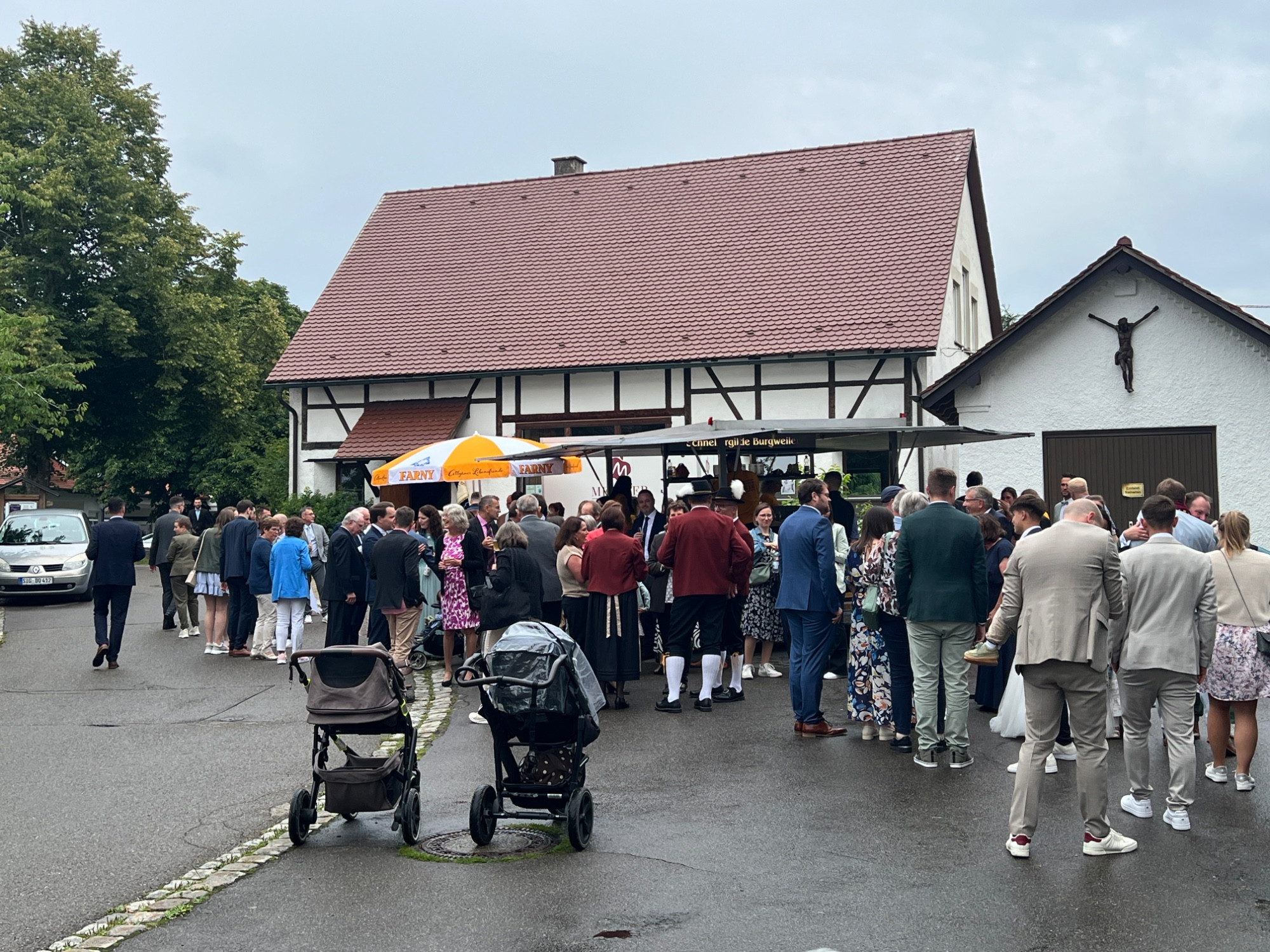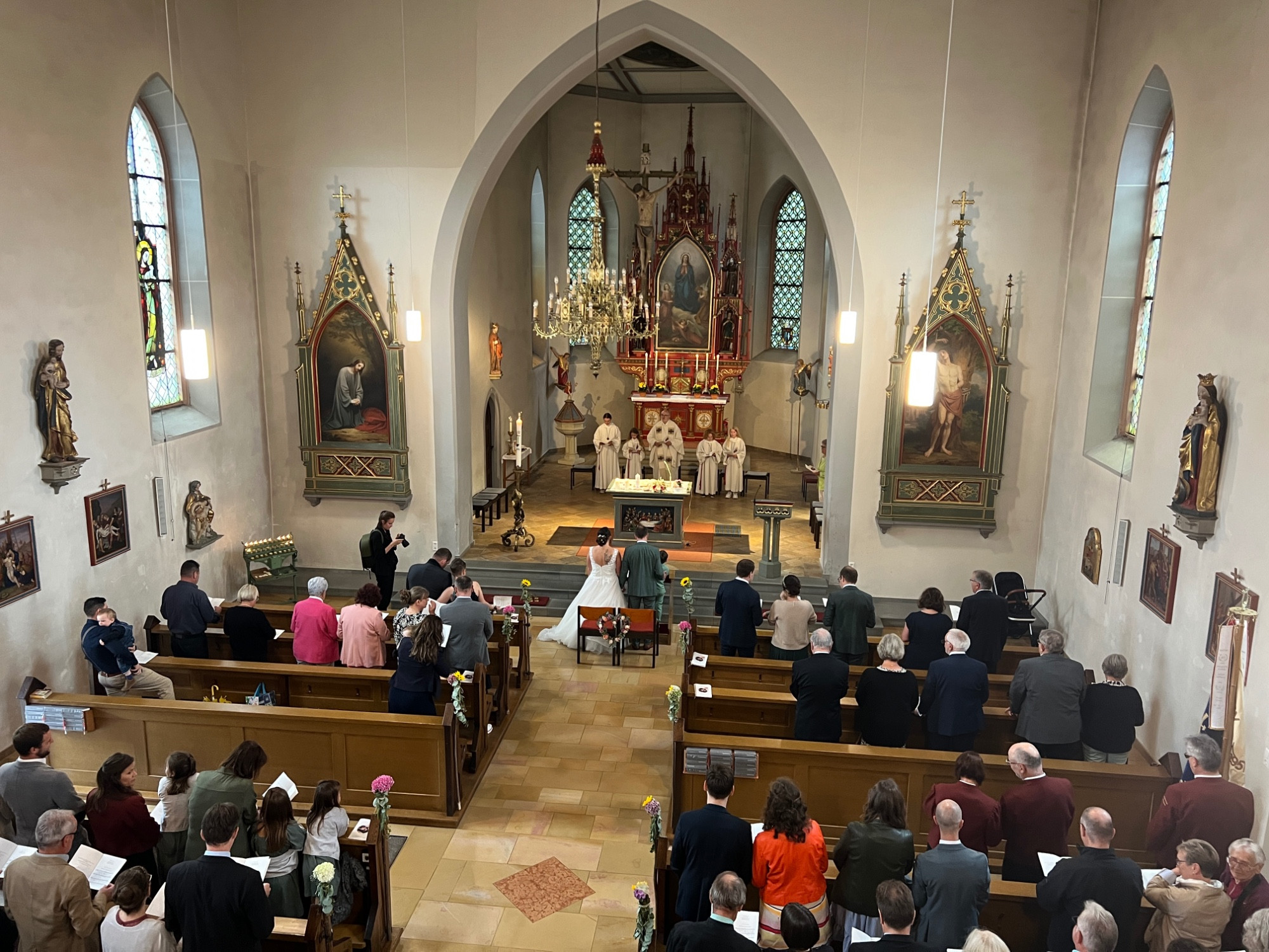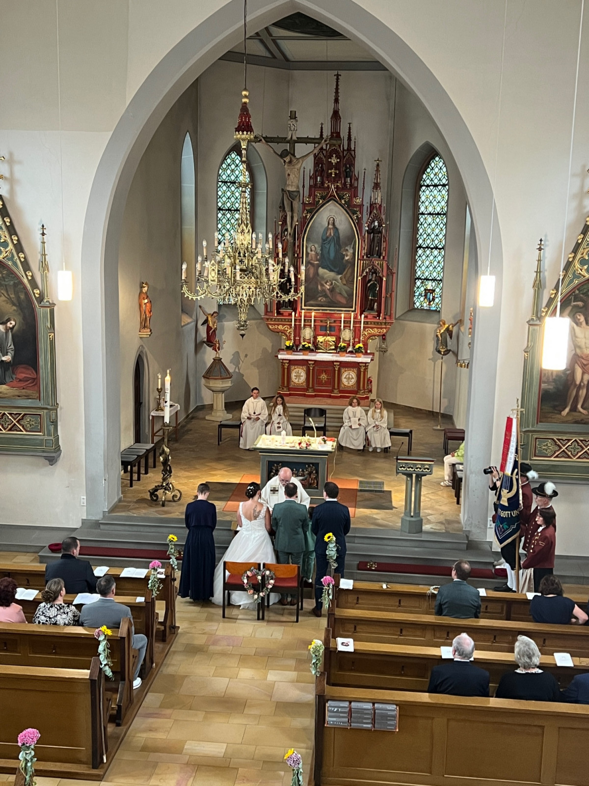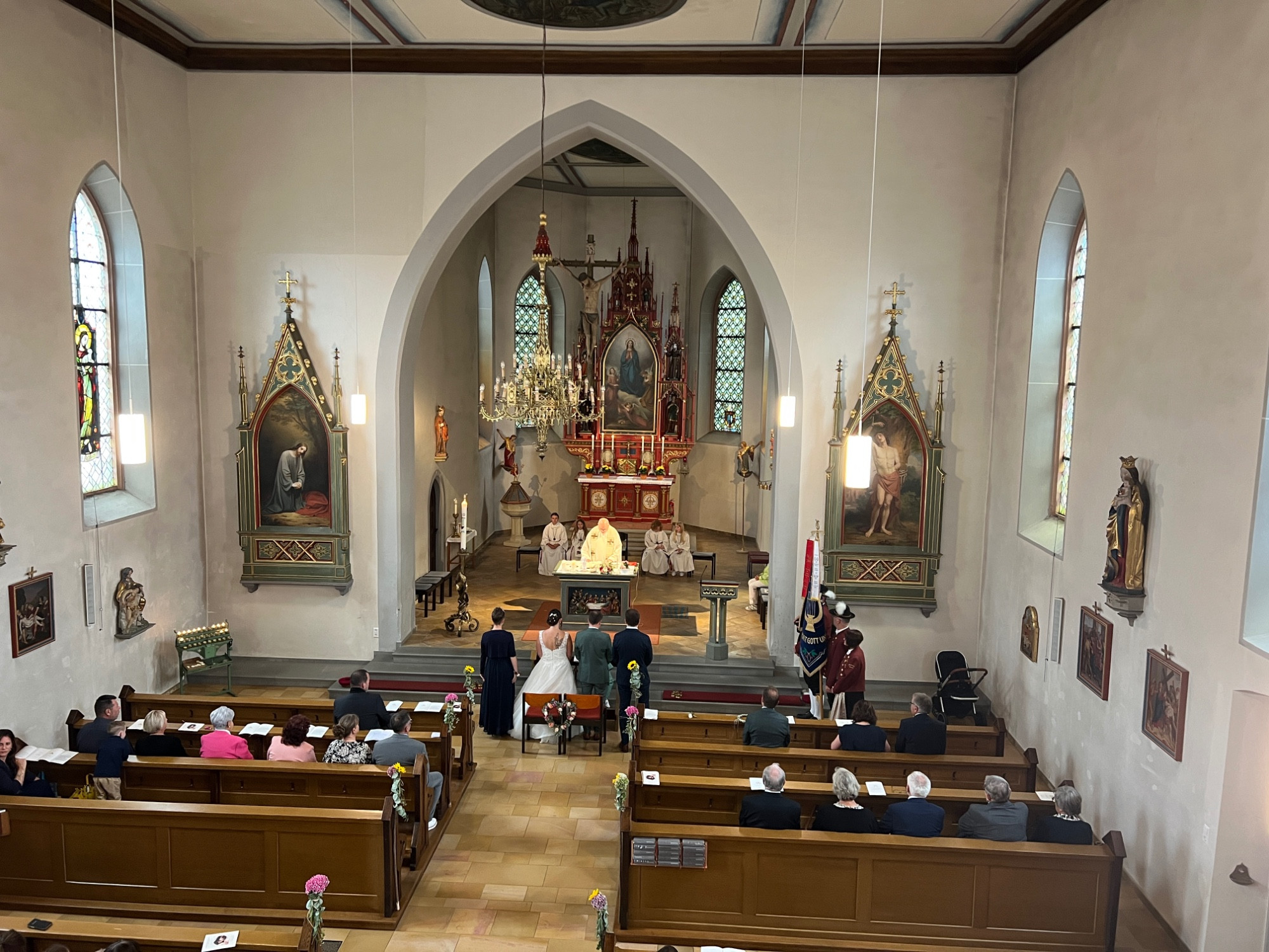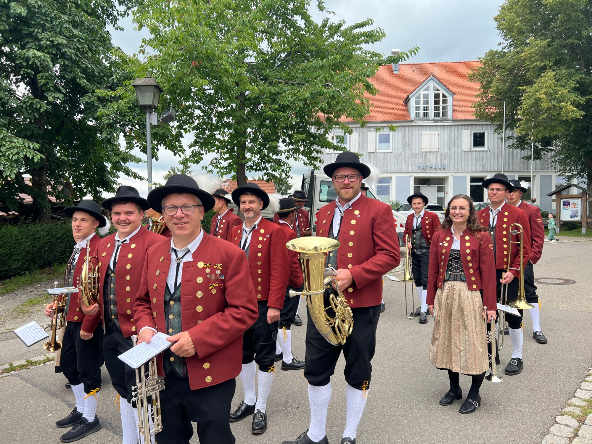 Nach einer produktiven Generalprobe am Freitagabend in der Kirche stand am Samstag dann die kirchliche Trauung an. Zur großen Erleichterung hielt das trockene Wetter an und der Regen hielt sich zurück. Nachdem die aktive Kapelle gemeinsam mit dem Brautpaar zur Kirche marschiert war, fand um 13:30 Uhr die wunderschöne Traufeier statt. Der Musikverein durfte den Gottesdienst gemeinsam mit der Organistin musikalisch begleiten. Das Brautpaar gab sich vor der Familie, Freunden und Vereinskameraden das Ja-Wort.