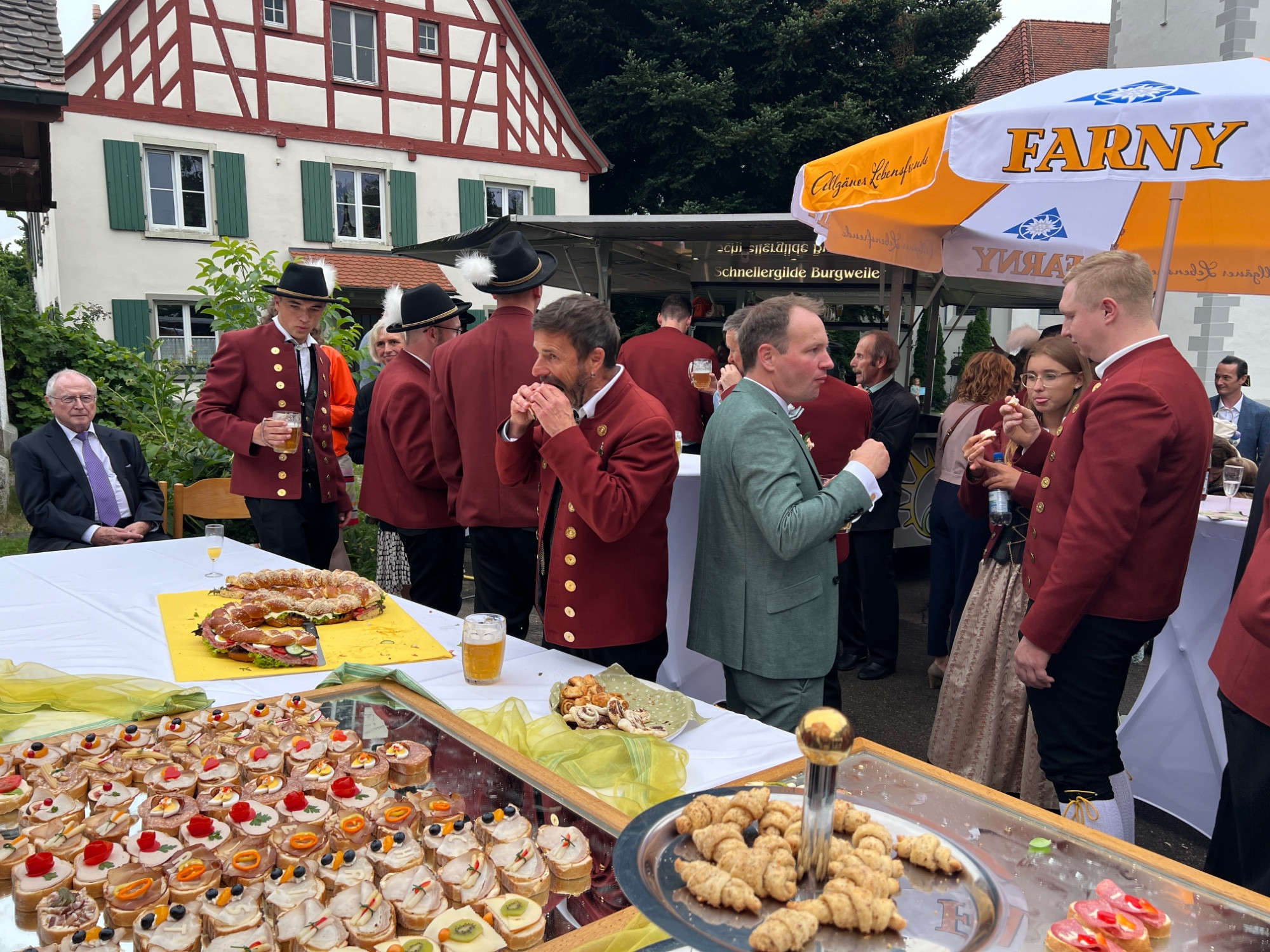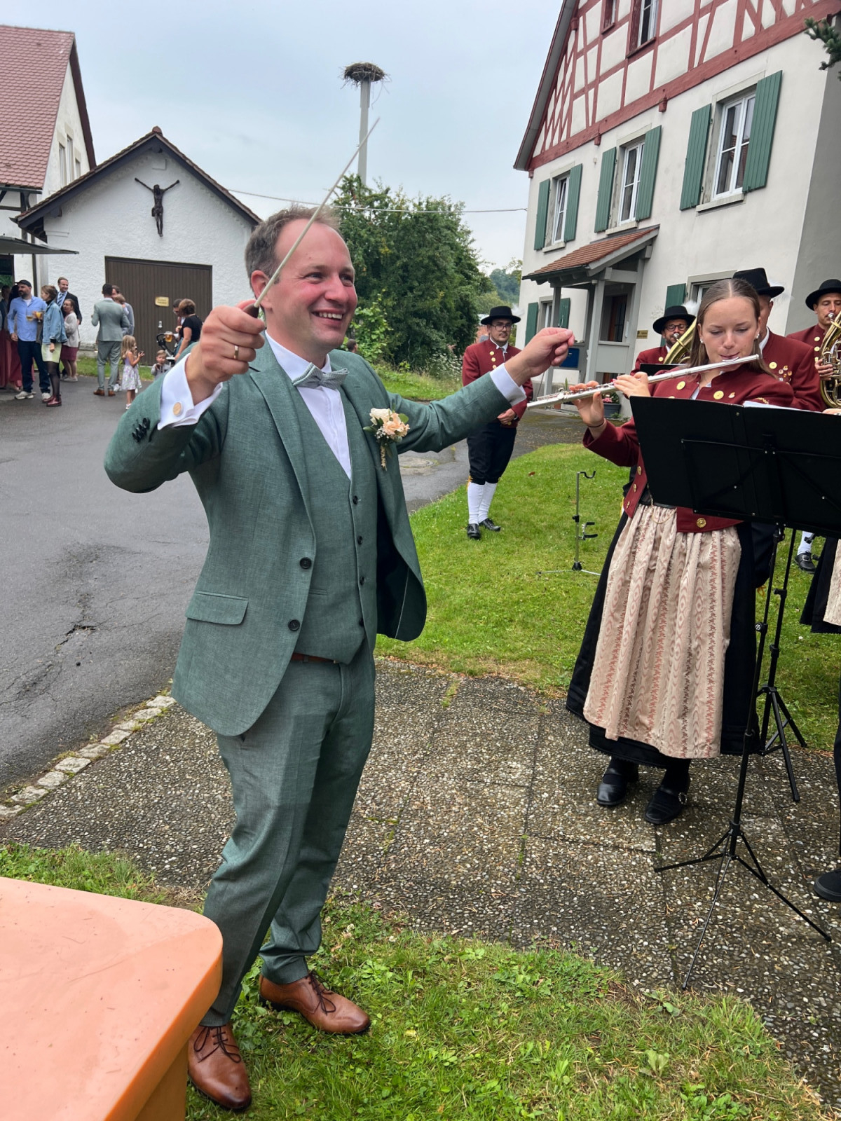 Auch beim anschließenden Sektempfang unterhielt der Musikverein die vielen Gäste mit ein paar Stücken, bevor dann auch die Musiker das leckere Buffett und den Getränkewagen „stürmten“. Sowohl Angela als auch Christoph, mussten zuvor jedoch noch ihr Talent an ihrem Instrument, dem Saxophon und der Posaune, sowie als Dirigent unter Beweis stellen.